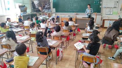 知っている先生の名前を発表しています。手がたくさんあがっていました。