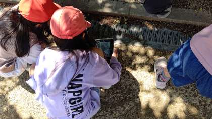 学校の生き物探しをしています。一人一台端末を使って、見つけた生き物を記録しています。