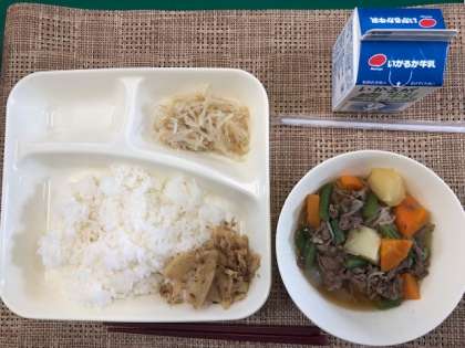 本日の献立は ・ご飯 ・肉じゃが ・もやしのゆずのかあえ ・ごまかかいため ・牛乳です。