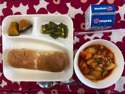 本日の献立は ・おさつパン ・ケチャップ煮 ・さんど豆とコーンのソテー ・焼きかぼちゃの甘蜜かけ ・牛乳 です。
