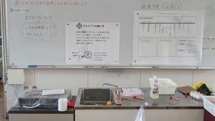 家庭科で調理実習を行いました。卵を炒めて過熱による変化を調べるために、スクランブルエッグの調理を行いました。フライパンの使い方についても学習しました。5年生も1・2時間目に初めての調理実習をしました。