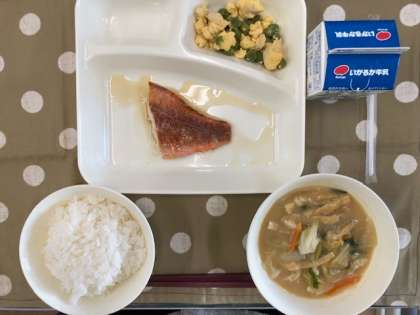 本日の献立は・赤魚のしょうゆだれかけ ・みそ汁 ・えんどうの卵とじ ・ご飯 ・牛乳です。