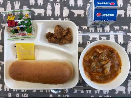 令和5年5月16日(火) 本日の献立 公開日 2023/05/16 更新日 2023/05/16 お知らせ 今日の献立は ・一口トンカツ ・ミネストローネ ・豆こんぶ ・コッペパン・アプリコットジャム です。 ミネストローネとは、イタリア語で「具だくさん」という意味で、たまねぎやにんじん、トマトなどの野菜がたくさん入ったスープのことをいいます。 今日の給食では、鶏肉とキャベツ、たまねぎ、トマトなどの野菜が使われています。 いいね(0)