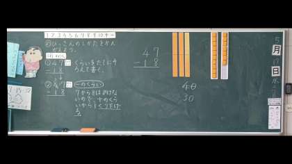 算数「ひっさんの仕方をかんがえよう」。繰り下がりのある引き算の仕方について学習しました。