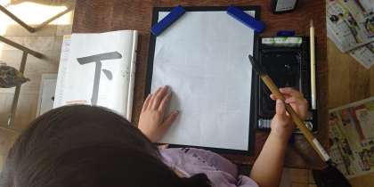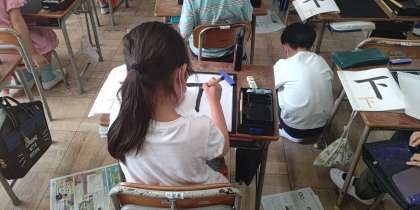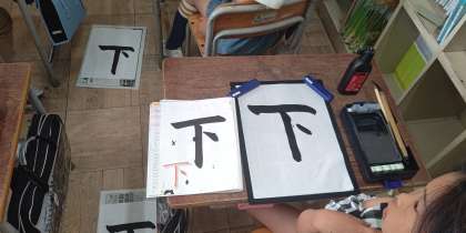 書写「下」の学習です。3画目の点の打ち方、場所によって大きく字の印象が変わります。