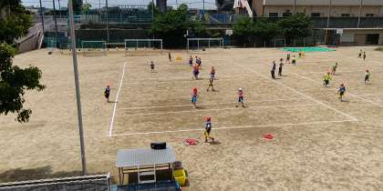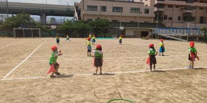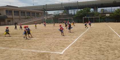 体育の学習です。腰に付けたフラッグを取られないように、動きを工夫してゴールを目指します。