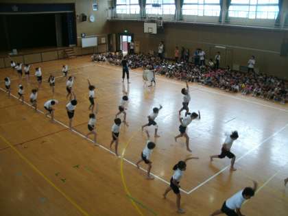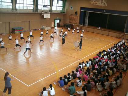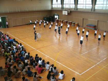 今日の児童集会は、応援団を中心とした全校児童による応援の練習でした。雨天の為、残念ながら講堂での練習になりましたが、応援団はこれまでの練習の成果を十分に発揮して、大きな声や力強い動きで全校児童をリードしていました。全校児童も応援団を手本にして、大きな声と手拍子でしっかり応援することができました。
