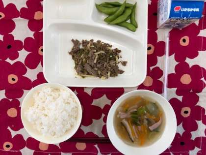 令和5年6月5日(月) 本日の献立 公開日 2023/06/05 更新日 2023/06/05 お知らせ 今日の献立は、・ご飯 ・チンジャオニューロスー ・ハムと野菜の中華スープ ・枝豆 ・牛乳 です。 チンジャオにゅーろうすーは、ピーマンと牛肉を細く切っていためた中国の料理です。中国語で、「青椒(チンジャオ)」はピーマン、「牛肉(ニューロウ)」は牛肉、「絲(スー)」は細切りという意味です。 牛肉とピーマンやたけのこなどをいため、砂糖やしょうゆ、オイスターソースなどで味付けしています。 いいね(0)