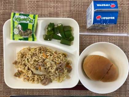 本日の献立は、・ミニ黒糖パン ・和風焼きそば ・オクラの甘酢あえ ・抹茶大豆 ・牛乳です。