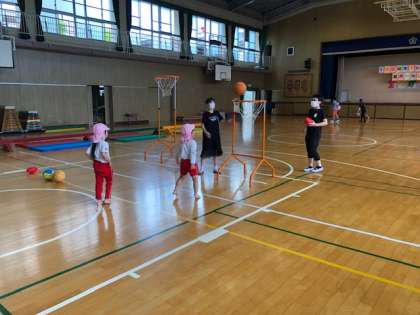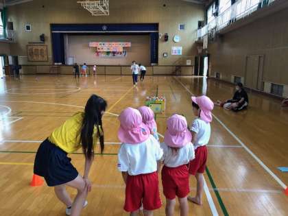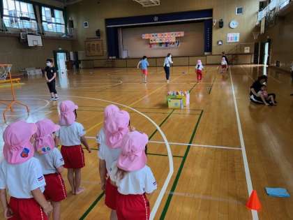 講堂全面を使って「ゴールをめざして」 今日は阿さひ保育園の皆さんがお客様として参加してくださっています!