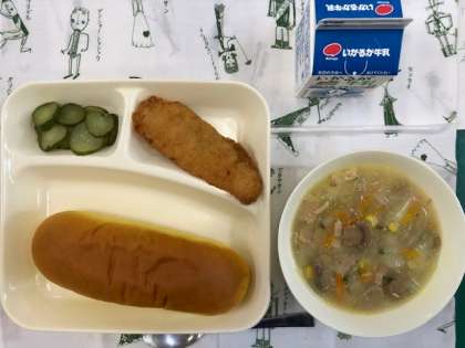 本日の献立は、パンプキンパン ・サーモンフライ ・豆乳スープ ・キュウリのバジル風味サラダ ・牛乳です。