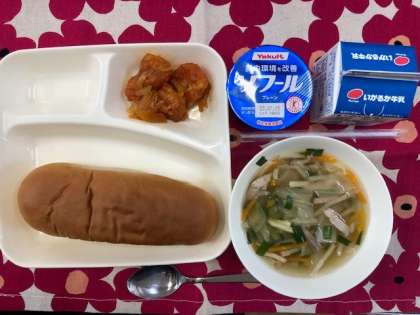 本日の献立は、・えびのチリソース ・中華スープ ・ヨーグルト ・パン ・牛乳です。