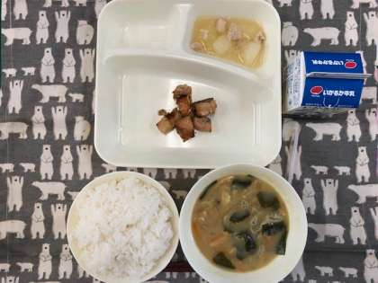 今日の献立は、・ご飯 ・鮭のつけやき ・みそ汁 ・冬瓜の煮物 ・牛乳 です。