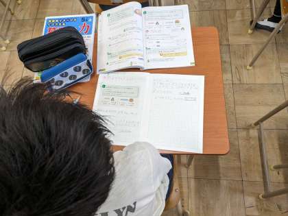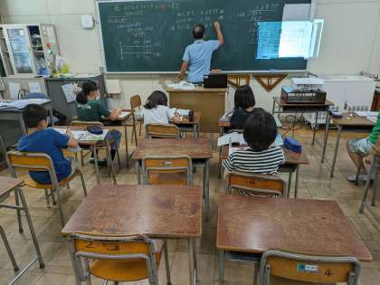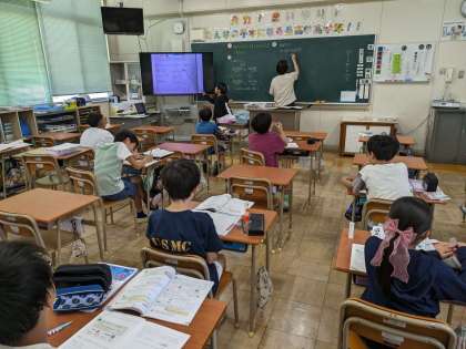 算数の学習です。ノートを大型モニターに映し、自分の考えを発表しています。