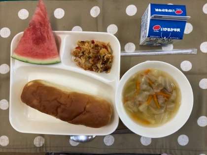 令和5年7月4日(火) 本日の献立 公開日 2023/07/04 更新日 2023/07/04 お知らせ 今日の献立は、 ・おさつパン ・パエリア ・ウインナーとキャベツのスープ ・すいか ・牛乳 です。 赤ピーマンは、トウガラシの仲間で、緑色のピーマンが畑で完全に熟すまで待ってから収穫します。 赤ピーマンは、緑色のピーマンと比べると、甘みがあり、栄養もたくさん含まれています。赤ピーマンは、今日の給食では、「パエリア」に入っています。 いいね(0)
