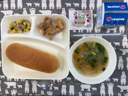 令和5年7月11日(火) 本日の献立 公開日 2023/07/11 更新日 2023/07/11 お知らせ 今日の献立は、・こっぺぱん・リンゴジャム ・鶏肉のから揚げ ・東岸の中華スープ ・ツナとチンゲンサイのいためもの ・牛乳 です。 毎日暑い日が続いていますね。熱いときは、たくさん汗をかきます。私たちの体は、汗をかくことで体温を下げています。水分は一度にたくさんとるのではなく、こまめにとることが大切です。汁物や水分の多い野菜、くだものでも水分をとることができます。 いいね(0)