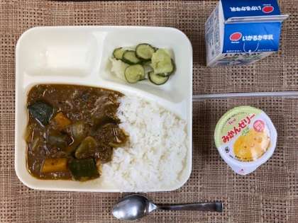 今日の献立は、・夏野菜のカレーライス ・キャベツときゅうりのサラダ ・みかんゼリー ・牛乳 です。