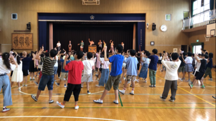 今日は全校集会の日です。今年が創立100周年になるので、昔から金塚小学校に伝わっていた金塚音頭を復活させようと、踊り隊を募り、練習を重ねてきました。今日はその踊り隊を中心に、全員で金塚音頭に取り組みました。元気な掛け声と共に、全員、覚えることができました。