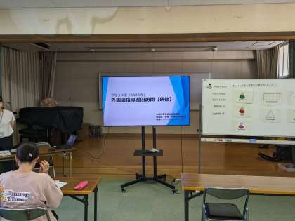大阪市教育委員会より講師の先生をお招きし、外国語指導研修会を行いました。指導に役立つ事例をたくさん教えていただきました。