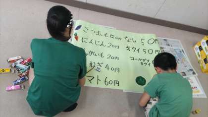 金塚小の子どもたちは有志で、キッズマートを行います。新鮮な野菜や果物は、毎年大人気です。