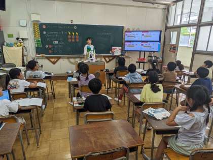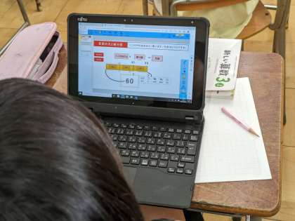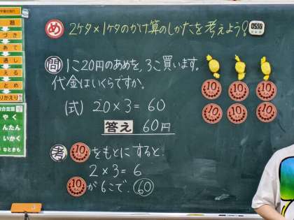 算数の学習です。ふたけたのかけ算の仕方について学習しています。