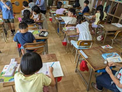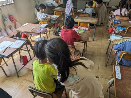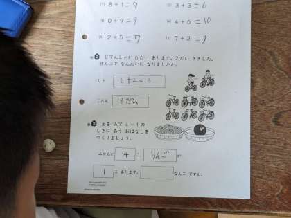 算数プリントにつぎつぎと取り組んでいます。困っている子に優しく教えてあげる姿が見られます。