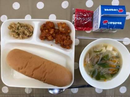 令和5年9月13日(水) 本日の献立 公開日 2023/09/13 更新日 2023/09/13 お知らせ 今日の献立は、・コッペパン ・いちごジャム ・ヤンニョムチキン ・豆腐のスープ ・切り干し大根のナムル ・牛乳です。 コチジャンやしょうゆ、ごま油などを混ぜ合わせた調味料のことを韓国・朝鮮では「ヤンニョム」と言います。 揚げた鶏肉にヤンニョムをからめたものが、ヤンニョムチキンです。 いいね(0)