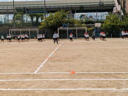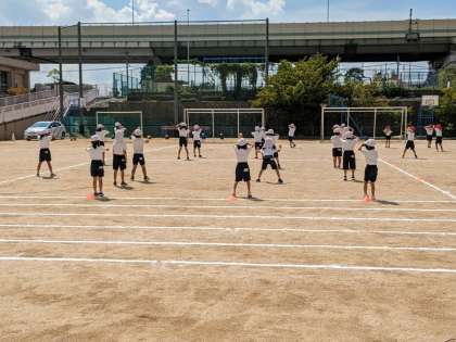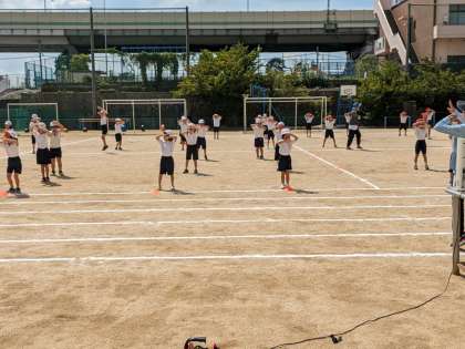 1.2年生が運動場で練習しました。暑い中でしたが、休憩をとりながら、がんばりました。
