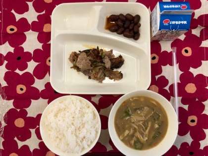 令和5年9月20日(水) 本日の献立 公開日 2023/09/20 更新日 2023/09/20 お知らせ 今日の献立は、・ご飯 ・豚肉の甘辛焼き ・冬瓜のみそ汁 ・金時豆の煮もの ・牛乳 です。 金時豆はインゲン豆の仲間です。色は、濃い赤紫色をしています。 たんぱく質のほか、炭水化物、おなかの調子を整える食物繊維などを多く含んでいます。 また、ビタミンB1やビタミンB2、貧血をふせぐ鉄なども含まれています。 いいね(0)