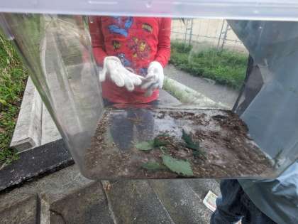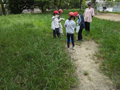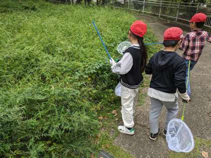ふれあい西公園で、生き物調べをしました。バッタを見つけてました。虫よりもくっつき虫がいっぱいで、あみにも服にもたくさんくっつきました。