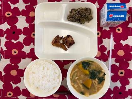 今日の献立は、・鶏肉の照り焼き ・かぼちゃのみそ汁 ・なすのそぼろ炒め ・牛乳です。
