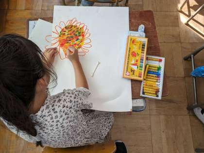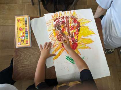図工の学習です。秋のひまわりの様子をパスを使って表現しました。