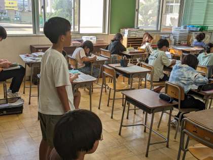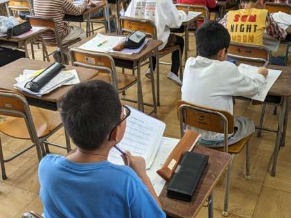 今日の音楽は歌のテストです。聴く人は、友だちの歌の良いところを見つけて、プリントに書いていきます。恥ずかしがらずに、きれいな声で歌えています。