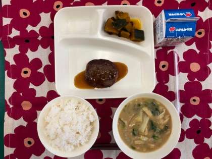 今日の献立は、・ご飯 ・和風ハンバーグ ・みそしる ・かぼちゃのいとこに ・牛乳 です。