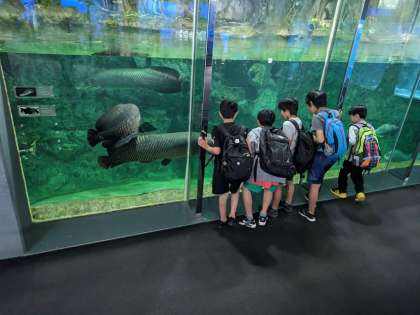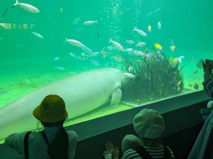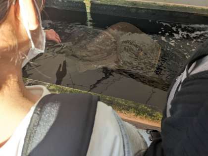 鳥羽水族館。餌やりの様子を見たり、実際に魚に触れたりしました。