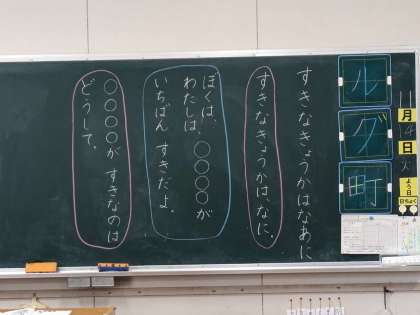11月14日 学習の様子 1年生 公開日 2023/11/14 更新日 2023/11/14 お知らせ 国語「すきな きょうかは なあに」の学習です。好きな教科とその理由を順序よく話す学習です。 いいね(0)