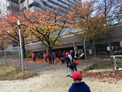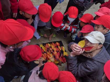 赤、黄のグラデーションになっている、葉の美しさに、子どもたちは大喜びです。また、大きい葉っぱ、小さい葉っぱ、虫食いの葉っぱなど、いろんな葉が材料となって学びを深めることができました。