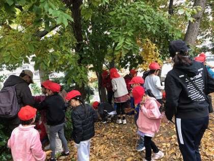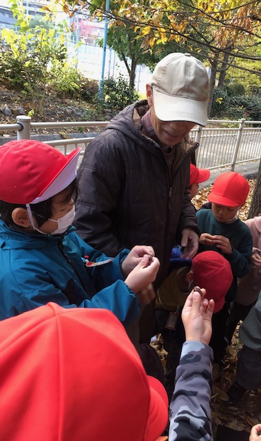 次に、場所を変えて、どんぐりを探しに行きました。残念ながら芽が出ているどんぐりは見つけられませんでしたが、最後に菅井先生から、特別などんぐりをプレゼントしていただきました。