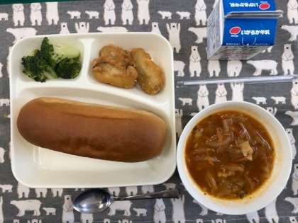 今日の献立は、・黒糖パン ・白身魚フリッター ・ミネストローネ ・ブロッコリーのサラダ ・牛乳 です。
