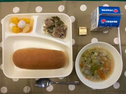 今日の献立は、・コッペパン ・豚肉と野菜のソテー ・白菜のスープ ・フルーツ白玉 ・牛乳 です。