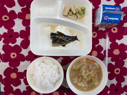今日の献立は、・ご飯 ・イワシの生姜煮 ・みそ汁 ・高野豆腐の煮物 ・牛乳です。