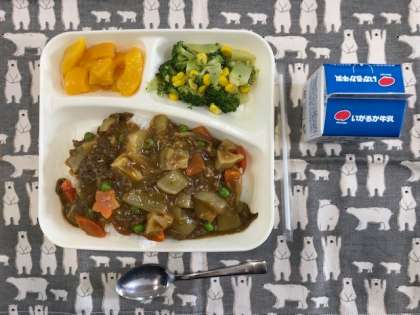 今日の献立は、冬野菜のカレーライス ・ブロッコリーとコーンのサラダ ・黄桃の缶詰 ・牛乳 です。