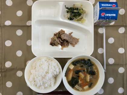 今日の献立は、・ご飯 ・豚肉のねぎ醤油焼き ・みそ汁 ・菊菜と白菜の胡麻和え ・牛乳です。