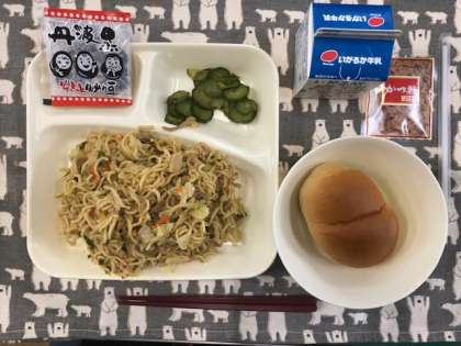 今日の献立は、・ミニ黒糖パン ・和風焼きそば ・きゅうりの生姜漬け ・炒り黒豆 です。