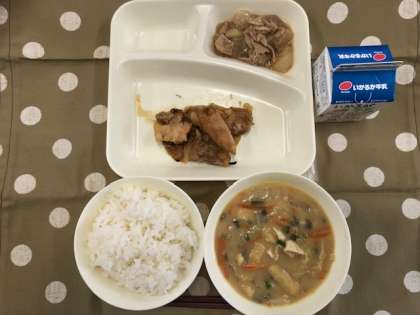 今日の献立は、・ご飯 ・鶏肉の甘辛焼き ・みそ汁 ・大根の煮物 ・牛乳です。