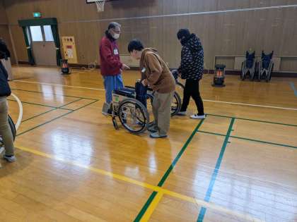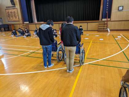 大阪市立心身障がい者リハビリテーションセンターから、講師の先生をお招きし、車いす体験講習会を行いました。子どもたちは、車いすの部分の名前や扱い方についてお話しを聞いたあと、講堂や廊下で体験学習をしました。
