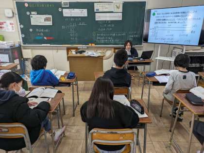 1月17日 学習の様子 5年生 公開日 2024/01/17 更新日 2024/01/17 お知らせ 算数、百分率の学習です。小数の割り算をしたあと、百分率になおす学習をしました。大阪市教育センターの先生に授業参観や指導をしていただきました。 いいね(0)