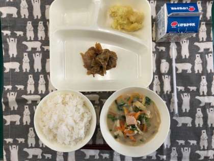令和6年1月22日(月) 本日の献立 公開日 2024/01/22 更新日 2024/01/22 お知らせ 今日の献立は、・ご飯 ・鶏肉の甘辛焼き ・粕汁 ・栗きんとん ・牛乳 です。 粕汁は、酒粕を入れた具だくさんの汁物です。酒粕の働きで、体が温まるので、冬に食べられることが多いです。 今日の給食の粕汁には、鮭、つきこんにゃく、薄揚げ、大根、人参、青ネギが入っています。 いいね(0)