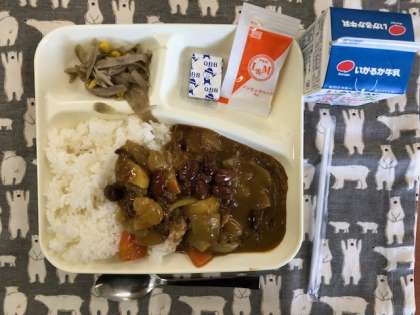 今日の献立は、・牛肉と金時豆のカレーライス ・ごぼうサラダ ・固形チーズ ・牛乳 です。