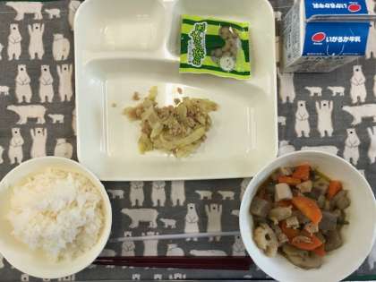 今日の献立は、・ご飯 ・筑前煮 ・ツナとキャベツのごま炒め ・抹茶大豆 ・牛乳 です。